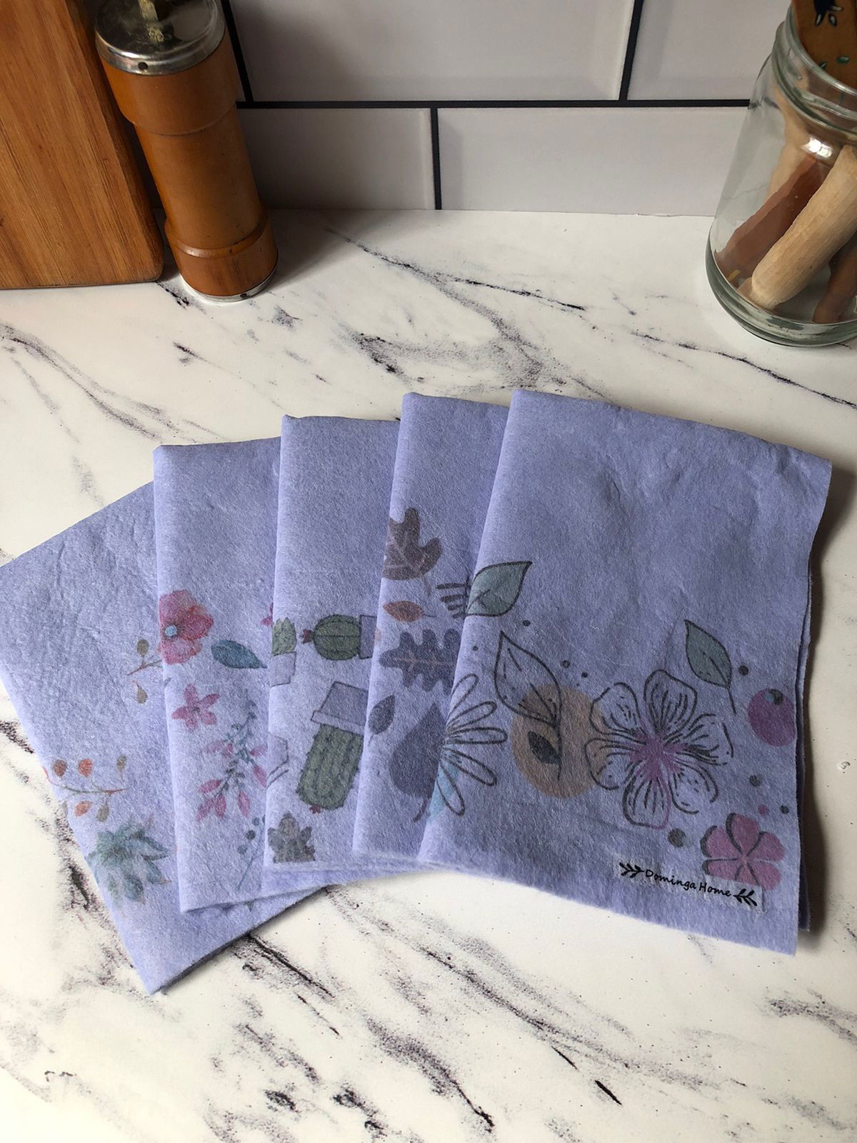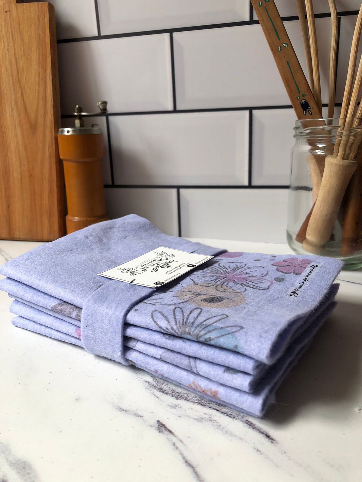 Paños de cocina multiusos, color celestes liliáceas con estampados surtidos.
